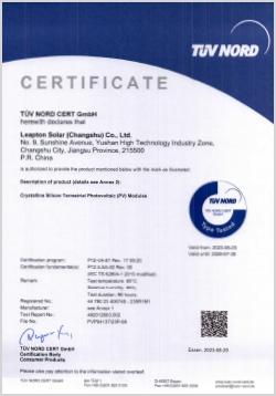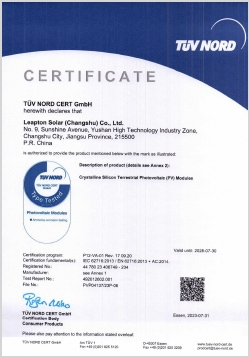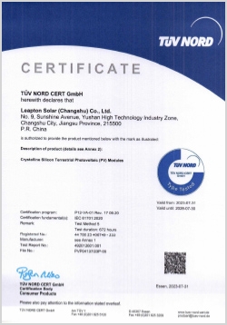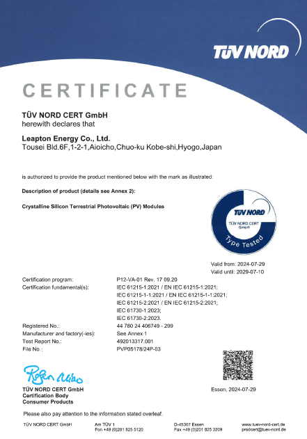 国家規格に基づいたドイツ政府公認の検査機関による、厳しい条件下(高温・高湿・高電圧)での各種性能試験、安全性試験、塩水、アンモニアガス、PID耐久試験に当社の太陽電池モジュールがクリアしたことを証明しています。