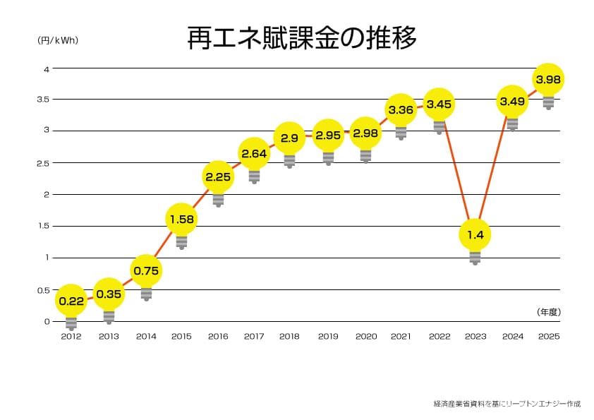 FIT制度が開始された2012年の0.22円でスタートし、再エネ賦課金の単価は年々上昇を続けています。2023年度に一度下がったものの、2024年度は過去最高値となり、2025年度は更に上昇することが決定しました。