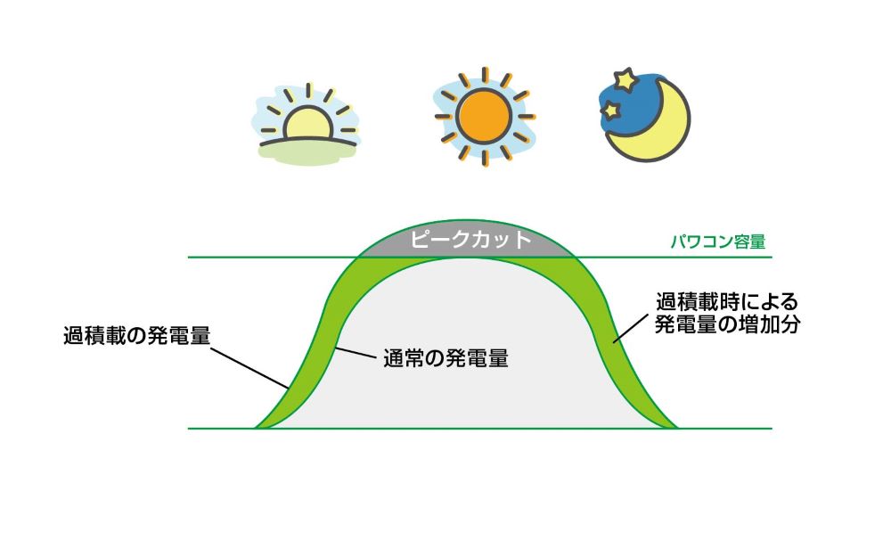 太陽光発電の過積載とは、太陽電池モジュールの枚数を増やすことでパワーコンディショナーの最大容量を上回る電力を得ようとする設置方法です。